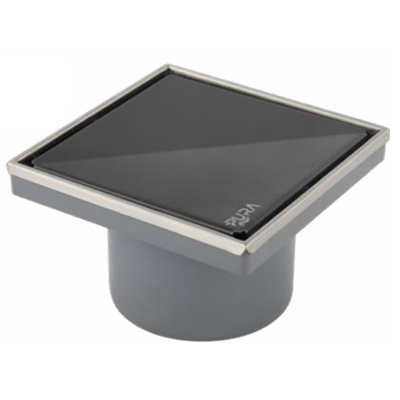 بيبه حمام بالوش 15سم FD-GB-15 بالعلاية تصريف رأسي 110مم زجاج أسود لامع اطار معدن كروم من بيورا