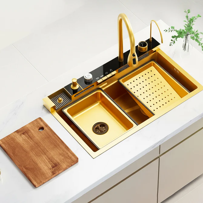 حوض مطبخ سمارت بيانو ديجيتال 5 ازرار 45×75سم بجميع المشتملات ذهبي من اصيل