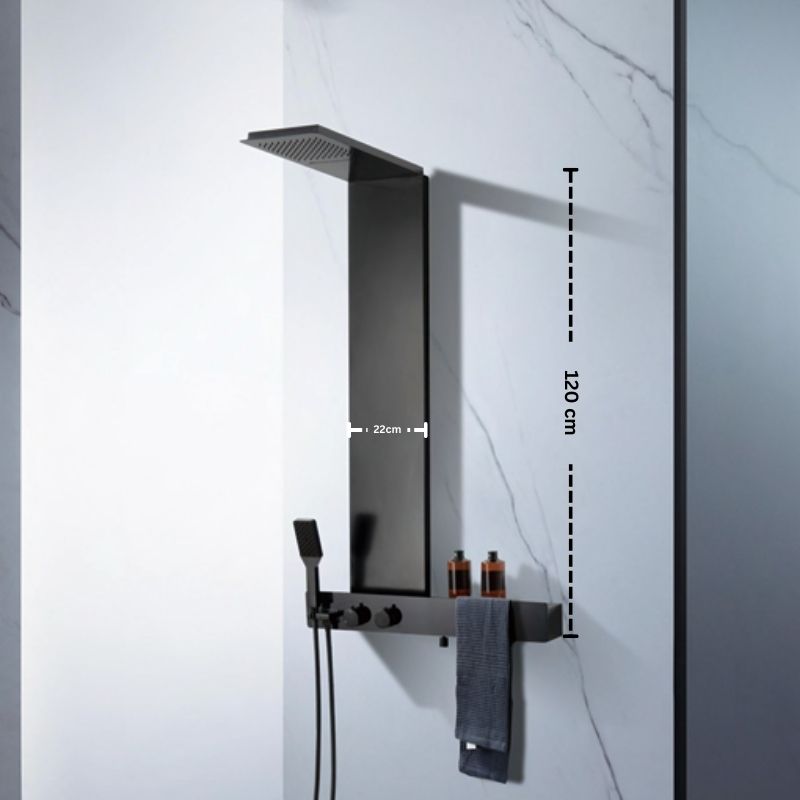 واحدة من أهم مميزات هذا الشاور بانل هي وجود رفّين عمليين لتخزين مستلزمات الحمّام الأساسية مثل الشامبو، البلسم، جل الاستحمام وغيرها. هذا يعني أنّك لن تحتاج إلى حوامل إضافية أو ثقوب كثيرة في الحائط.
