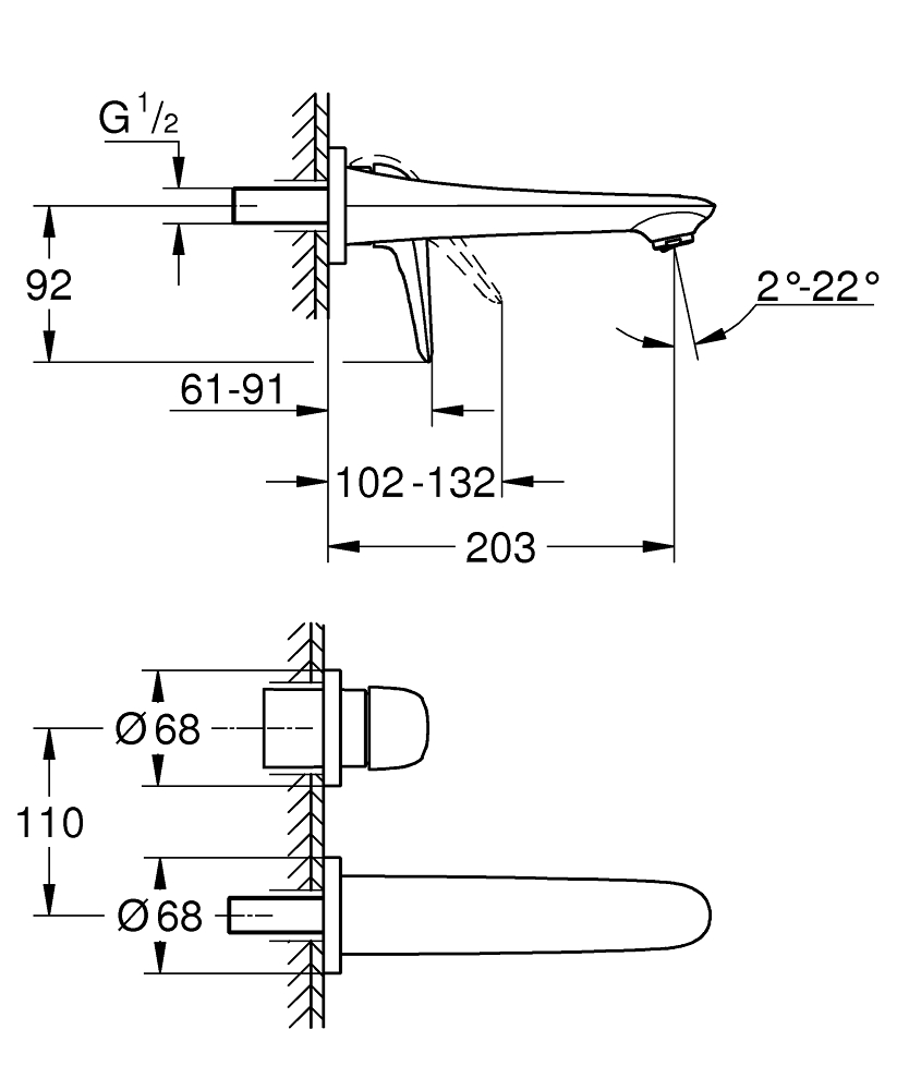 أضف لمسة عصرية أنيقة لحمامك مع خلاط الحائط من مجموعة Eurostyle برقم 29097003 من GROHE، المصمم خصيصاً للتركيب الدفين (wall‑mounted) بمسافة بروز 203 مم (20.3 سم) لتدفق ماء ملائم بعيداً عن الجدار.